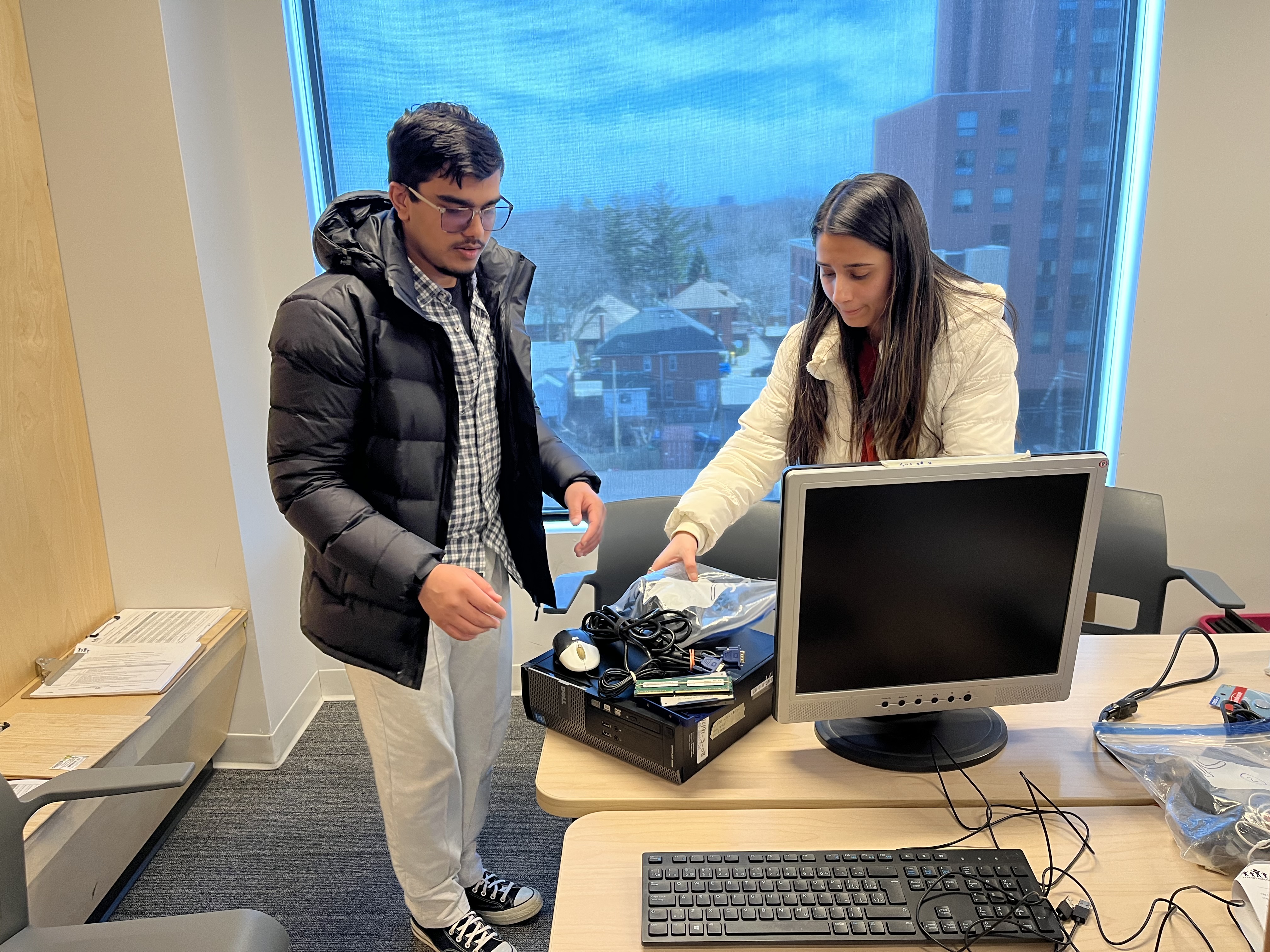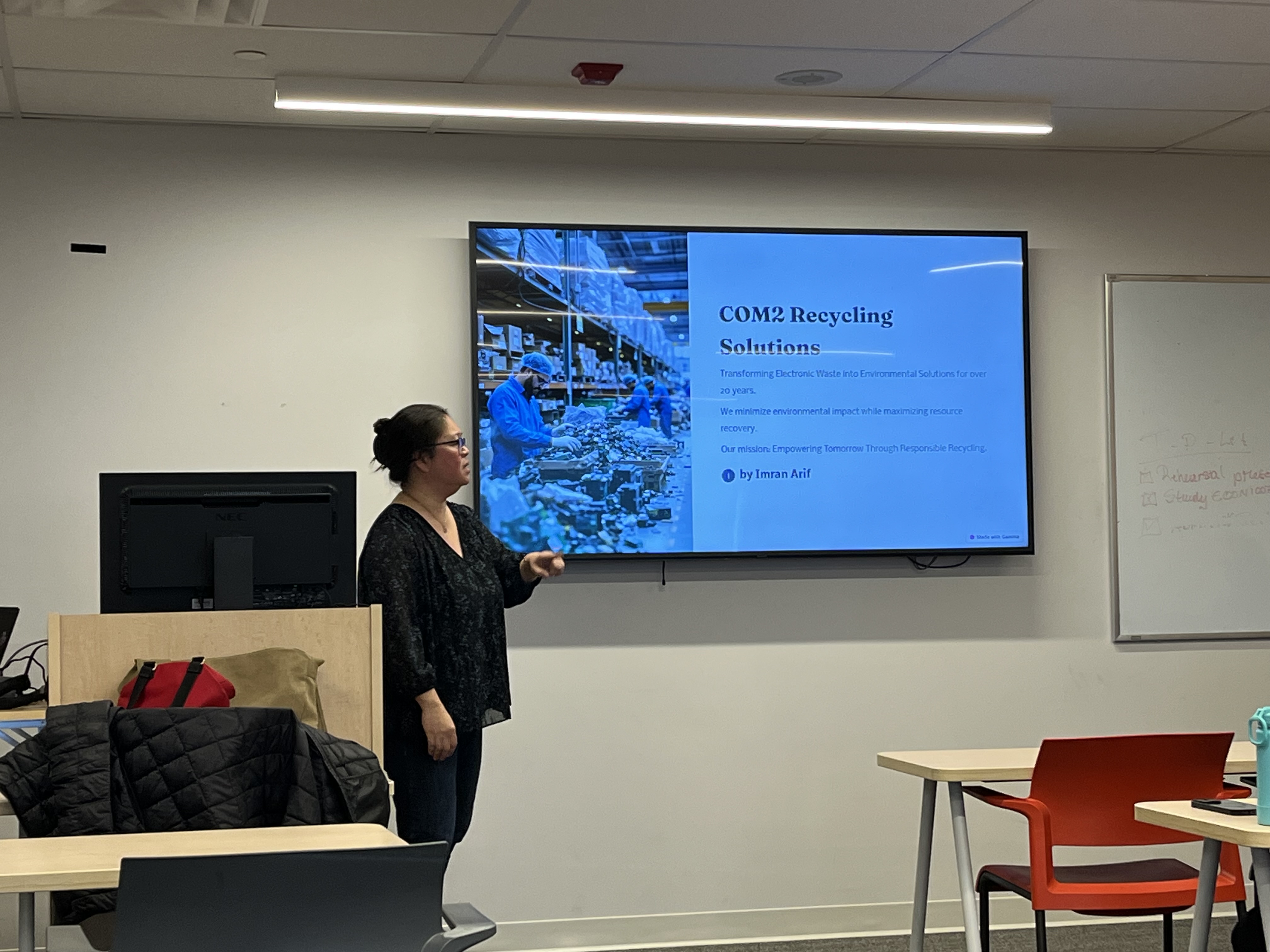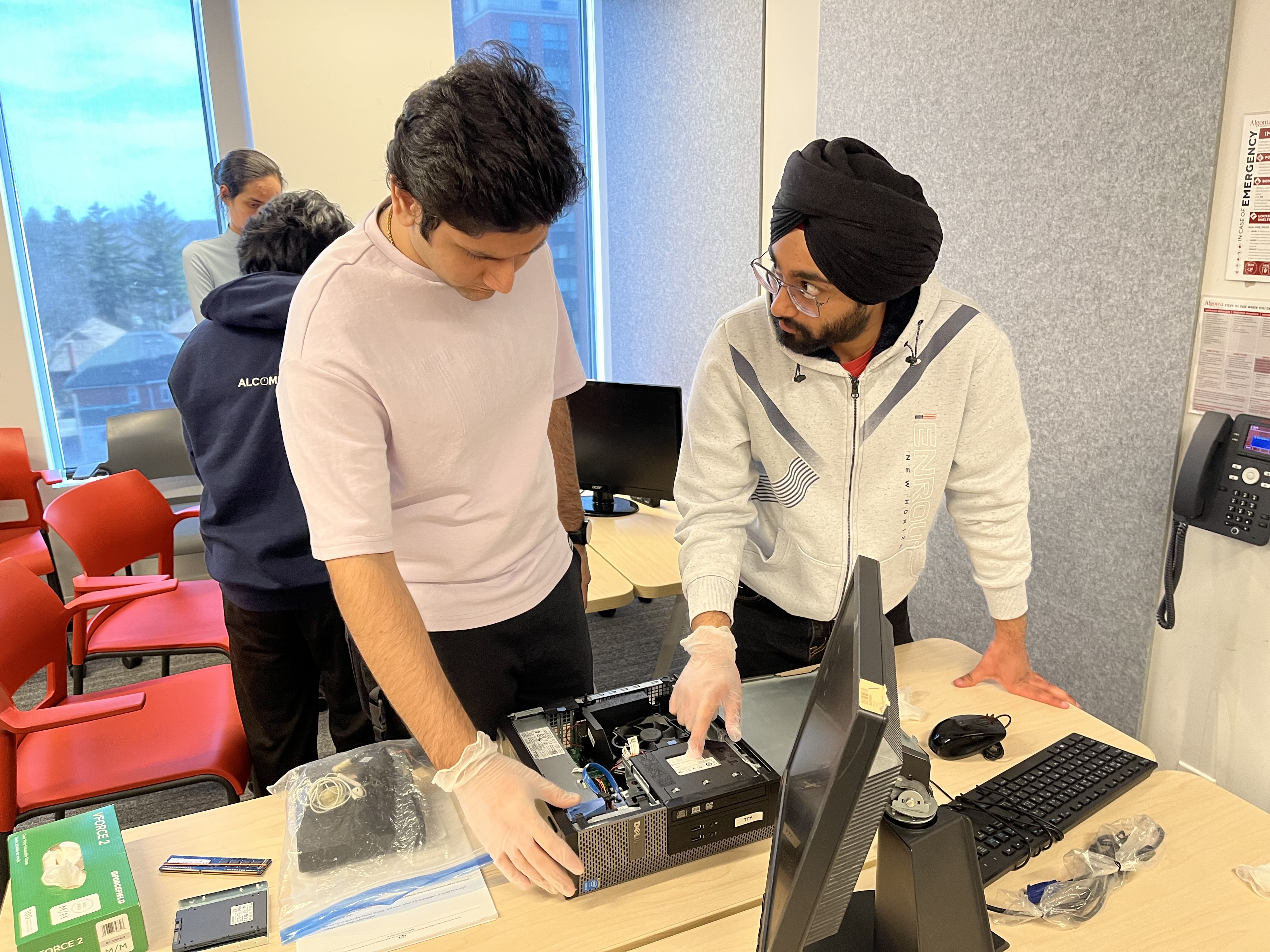 The workshop also delved into the topic of e-waste, highlighting its environmental impact and solutions. Participants learned that e-waste contributes significantly to global greenhouse gas emissions due to hazardous waste production and the consumption of rare minerals during manufacturing. The event emphasized how refurbishing extends device lifetimes, reducing the need for new production and minimizing e-waste. Students explored what happens when e-waste is recycled—valuable materials are recovered for reuse—and discussed strategies for raising awareness about sustainable practices. Using tools like computer testing kits, cleaning kits, an e-waste bin, desktops for testing, and Let’s Get Together Canada’s portable supplies kit, participants conducted assessments such as identifying processors and determining hard drive health.