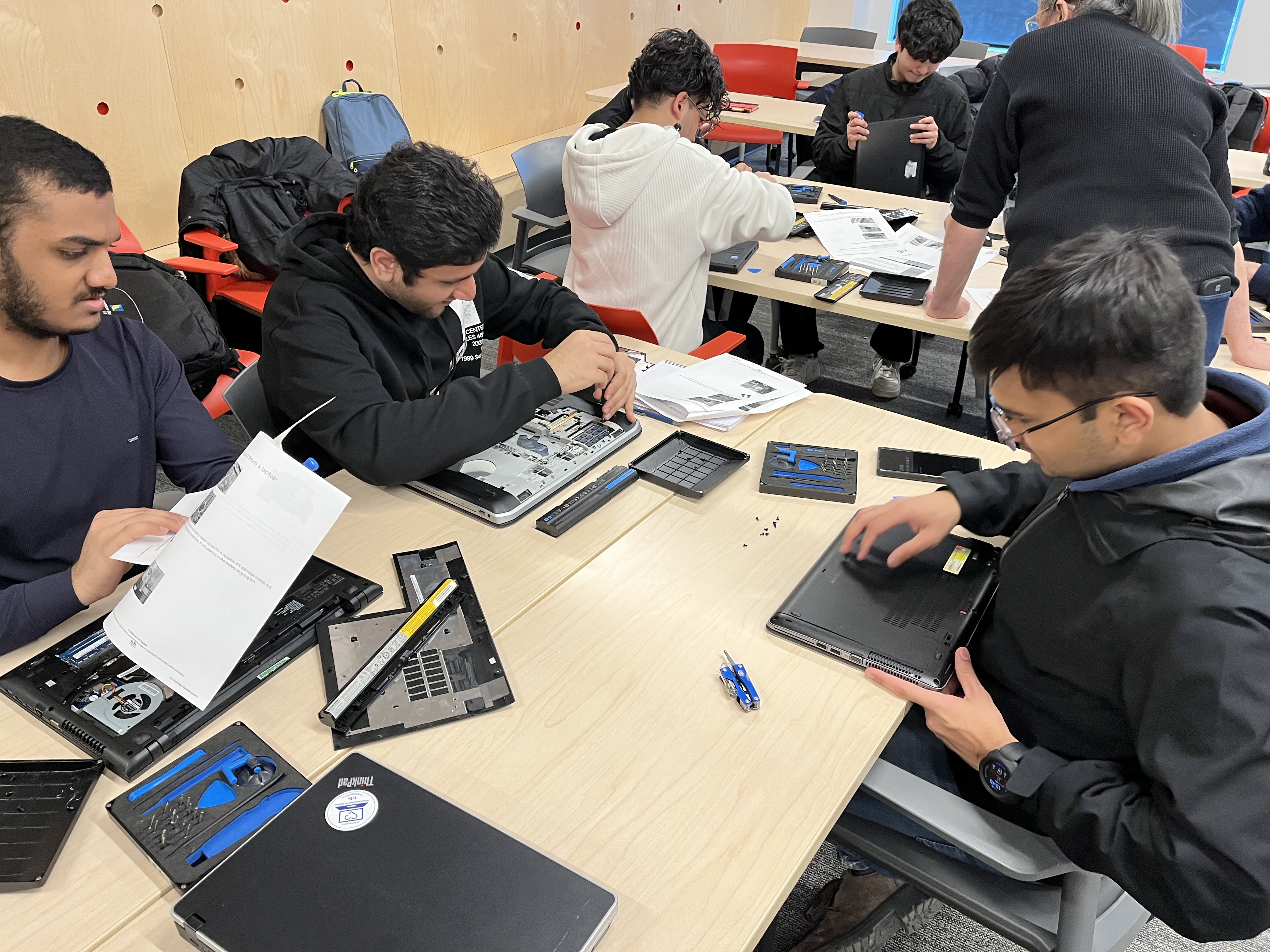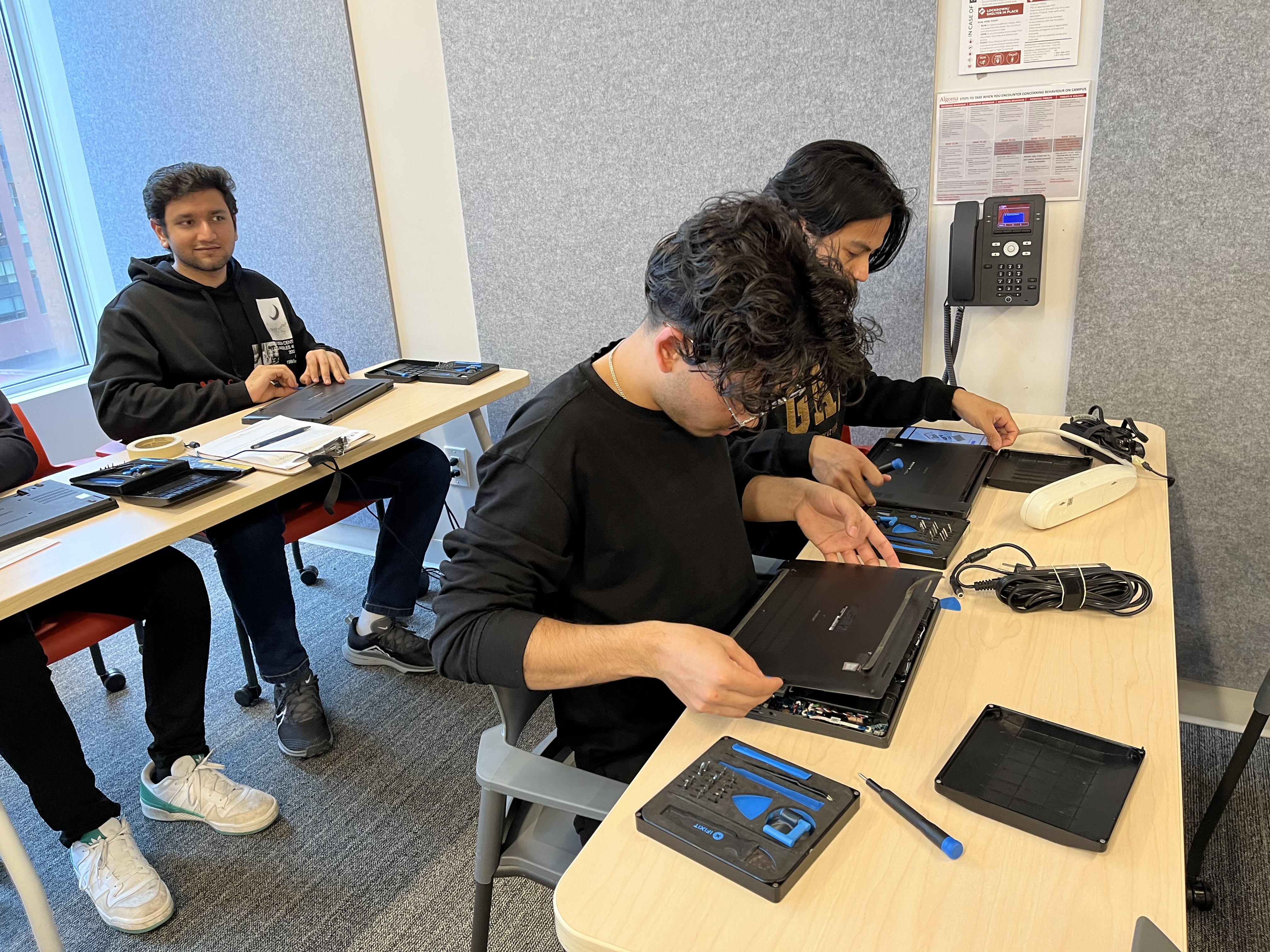 The workshop was structured into three modules: Computer Anatomy, Recycling and Refurbishing, and Checklist for Completed Work. In the Computer Anatomy module, participants learned about different computer parts and their functions, gaining foundational knowledge essential for repair work. The Recycling and Refurbishing module focused on removing old storage drives to ensure privacy, upgrading laptops to include a minimum of 8GB of RAM, and replacing faulty components to restore functionality. The Checklist for Completed Work module helped participants systematically review their repairs to ensure quality and efficiency. Additionally, safety protocols were reviewed comprehensively before the hands-on portion began. Participants were introduced to tools and equipment used during the workshop, provided with personal protective equipment (PPE), and trained on how to use it effectively. The importance of maintaining clean workspaces was emphasized, along with regular audits to ensure safety compliance. WHMIS (Workplace Hazardous Materials Information System) guidelines were discussed to ensure safe handling of materials, while participants were reminded of the mantra “Work safe, work smart!” First aid areas, procedures, and emergency exits were clearly outlined, and a safety monitor was assigned to oversee operations throughout the session. These protocols ensured that participants could engage confidently in repair activities while prioritizing safety.